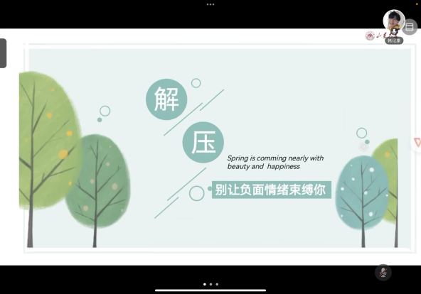 在交流环节,大家从学校的强大动员、工作人员的辛勤付出、隔离点的物资保障等角度分享自隔离转运以来的所见所闻、所思所想。刘星星从学校的有利组织、临淄的给力援助和学生的积极配合出发分享了隔离生活以来的感悟体会;巩婷婷回顾了转运隔离以来学校、学院和临淄隔离点给予的全方位的关怀关心,表达了“病毒无情,人间有爱”的美好祝愿;邢思源分享了方舱隔离的生活点滴和温暖瞬间,表明自己在未来会更主动发挥党员的先锋模范作用,为疫情防控贡献自己的力量。李建禄表达了学校在短短36小时内完成了13000余名师生转运的震撼,感恩所有工作人员的默默坚守与付出,他坚信杨柳依依之时,定会载归济上,续写山大荣光。韩记康分享了自己的“抗压”小妙招,他指出可以通过学习、追剧、听音乐等方式,让自己“忙”起来,化解负面情绪,保持积极向上的心态。张寒青向同学们推荐了健身操和针对性训练并讲解了健身前有关注意事项,鼓励大家隔离期间选择舒缓运动。